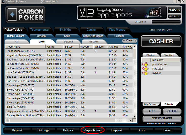 First login to your Carbon Poker software, click on Player Admin on the bottom of the screen.